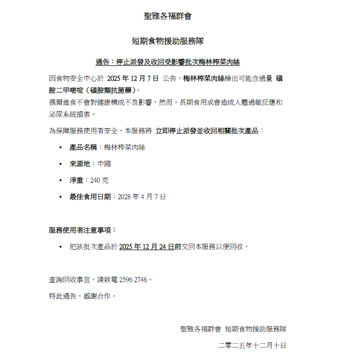 因食物安全中心於 2025年12月7日 公告,梅林榨菜肉絲檢出可能含過量 磺胺二甲嘧啶(磺胺類抗菌藥)。為保障服務使用者安全,本服務將立即停止派發並收回相關批次產品。請服務使用者把該批次產品於2025年12月24日前交回本服務以便回收。