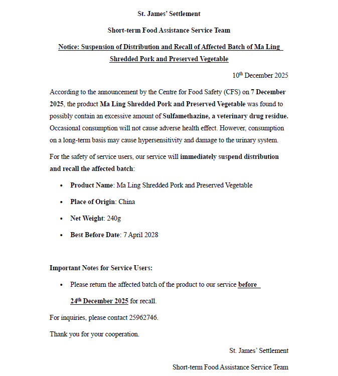 According to the announcement by the Centre for Food Safety (CFS) on 7 December 2025, the product Ma Ling Shredded Pork and Preserved Vegetable was found to possibly contain an excessive amount of Sulfamethazine, a veterinary drug residue. For the safety of service users, our service will immediately suspend distribution and recall the affected batch. Please return the affected batch of the product to our service before 24th December 2025 for recall.